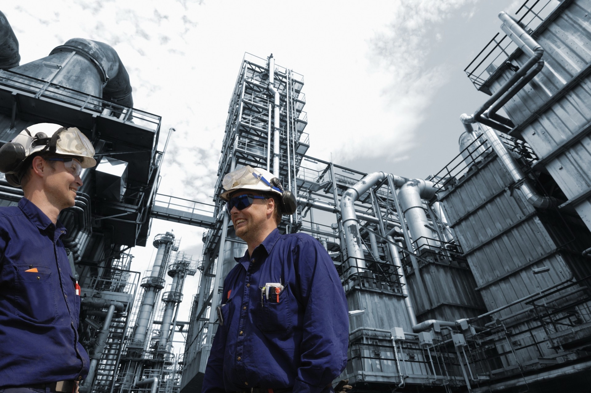 Ingénieurs au travail. Hommes en uniforme sur fond de construction industrielle
