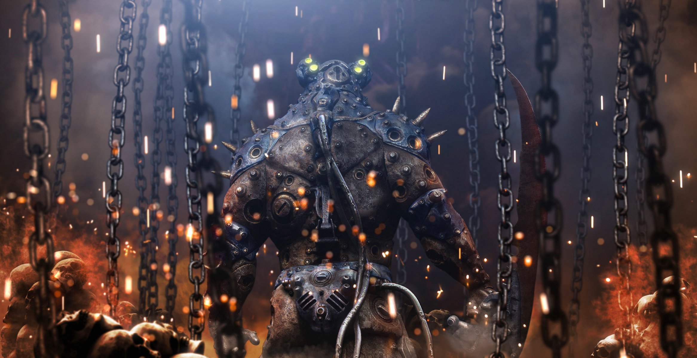 Guerrier de fer dans une armure rouge avec des armes et un casqueGuerrier de fer dans une armure rouge avec des armes et un casque