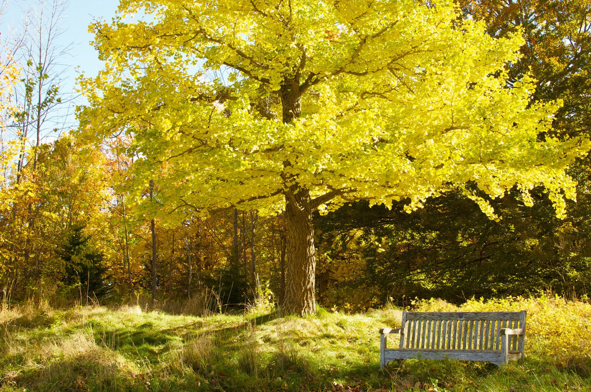 Arboretum en Angleterre. Banc devant le parterre de fleurs