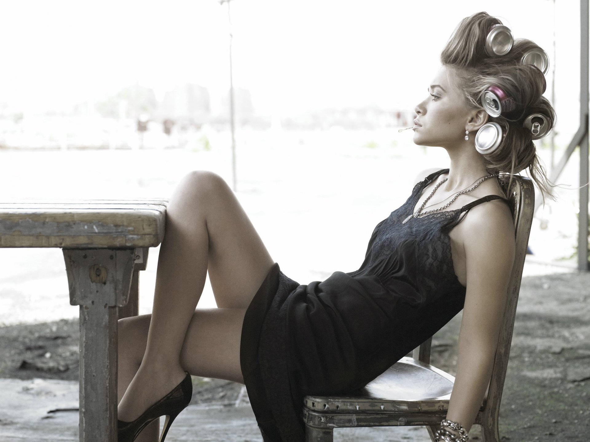 Elizabeth olsen sur la chaise. pied sur pied. table à côté