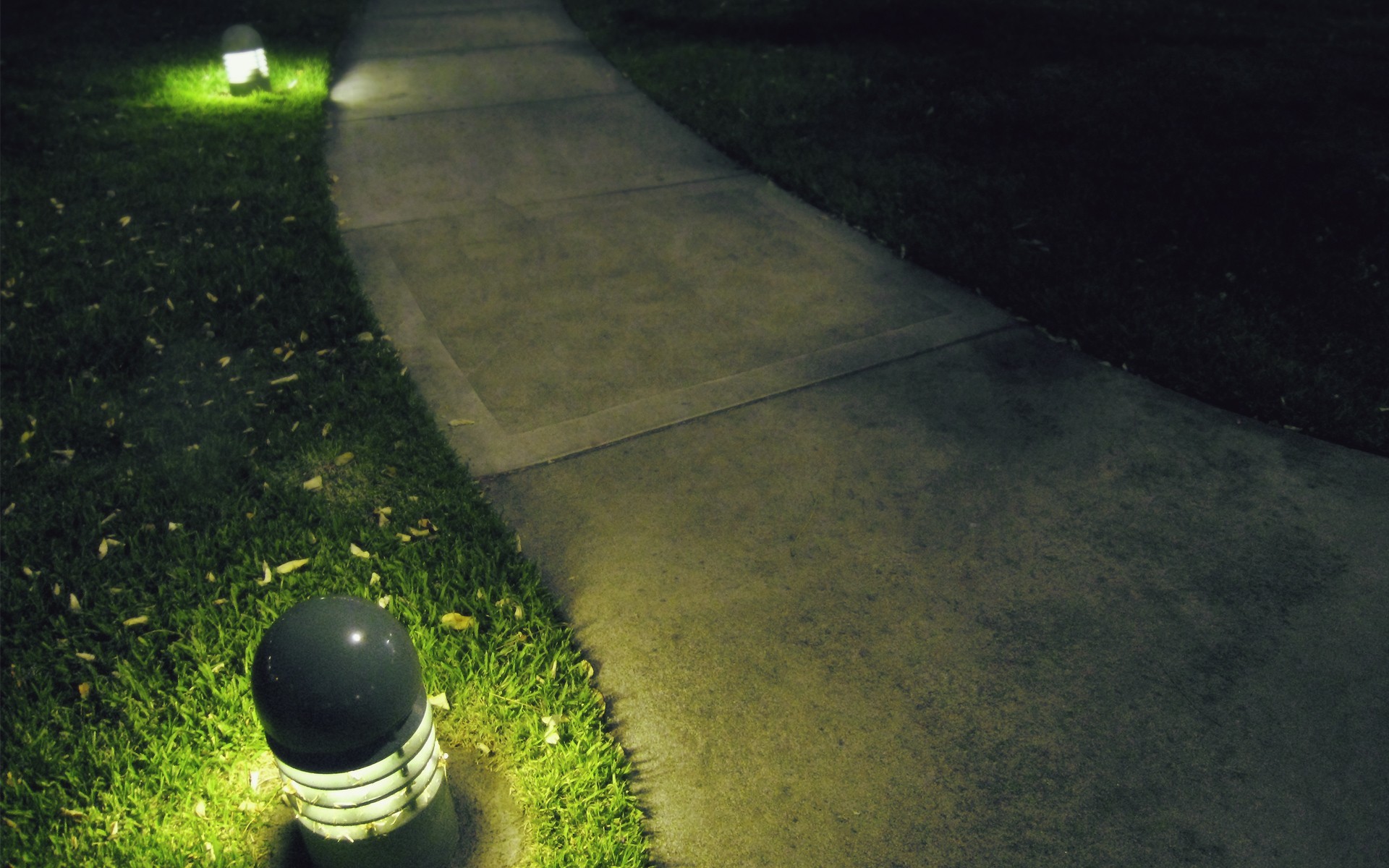 Chemin de jardin sur la pelouse, éclairé par des lanternesChemin de jardin sur la pelouse, éclairé par des lanternes