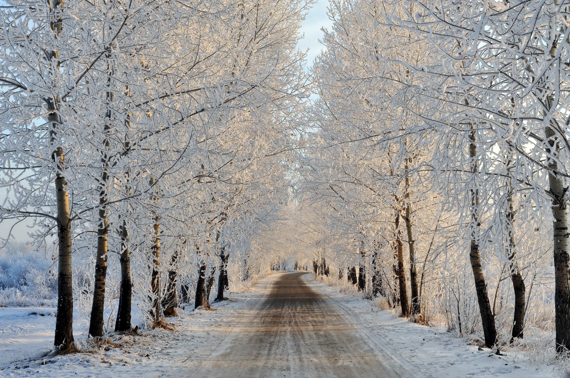 Paysage d'hiver de la route et des arbres sous la neigePaysage d'hiver de la route et des arbres sous la neige