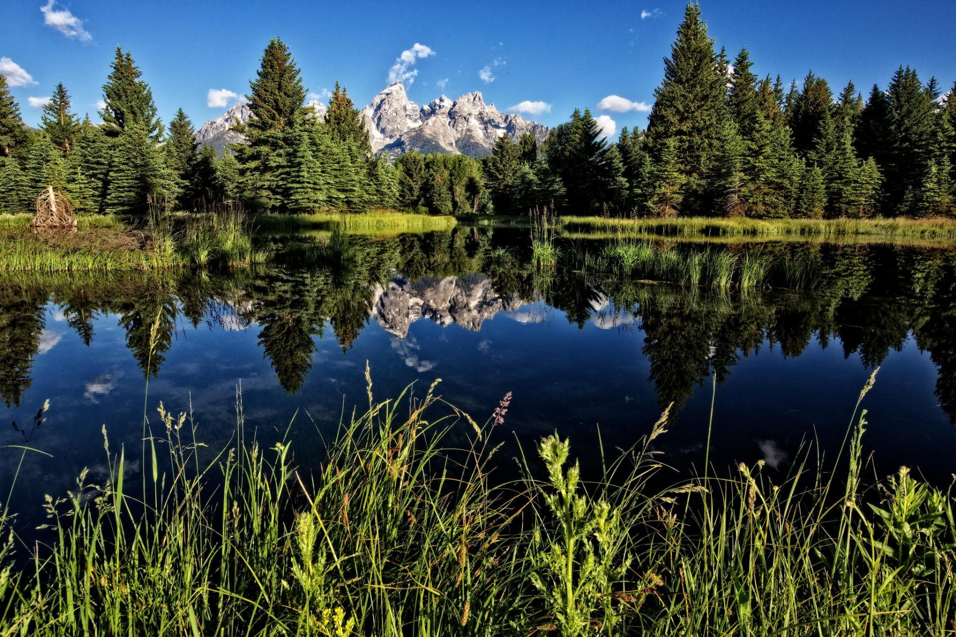 Lac bleu avec surface miroir sur fond de montagnesLac bleu avec surface miroir sur fond de montagnes