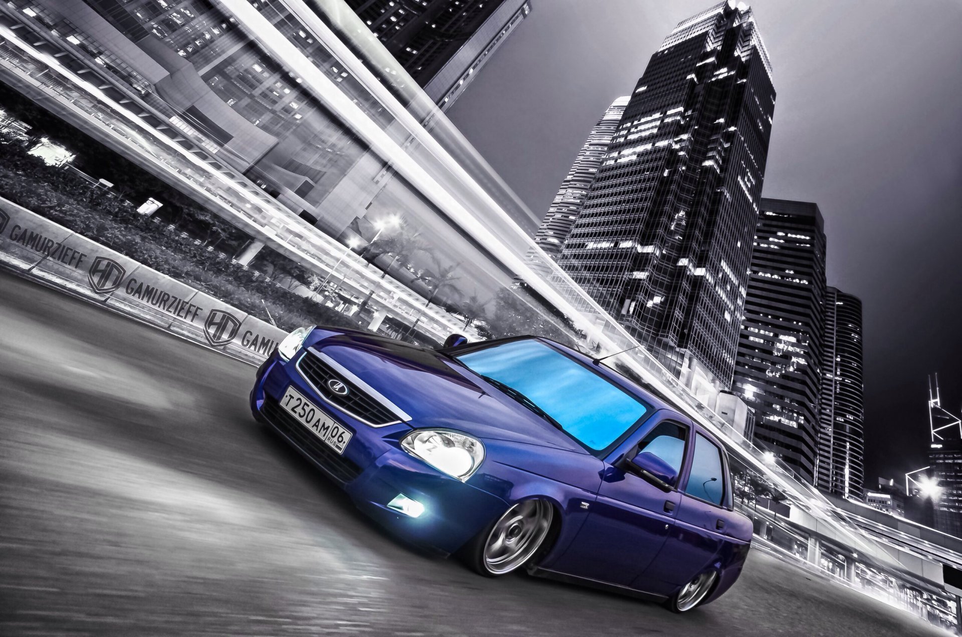 Lada priora de couleur indigo se précipite à travers la ville en noir et blanc de la villeLada Priora de couleur Indigo se précipite à travers la ville en noir et blanc de la ville
