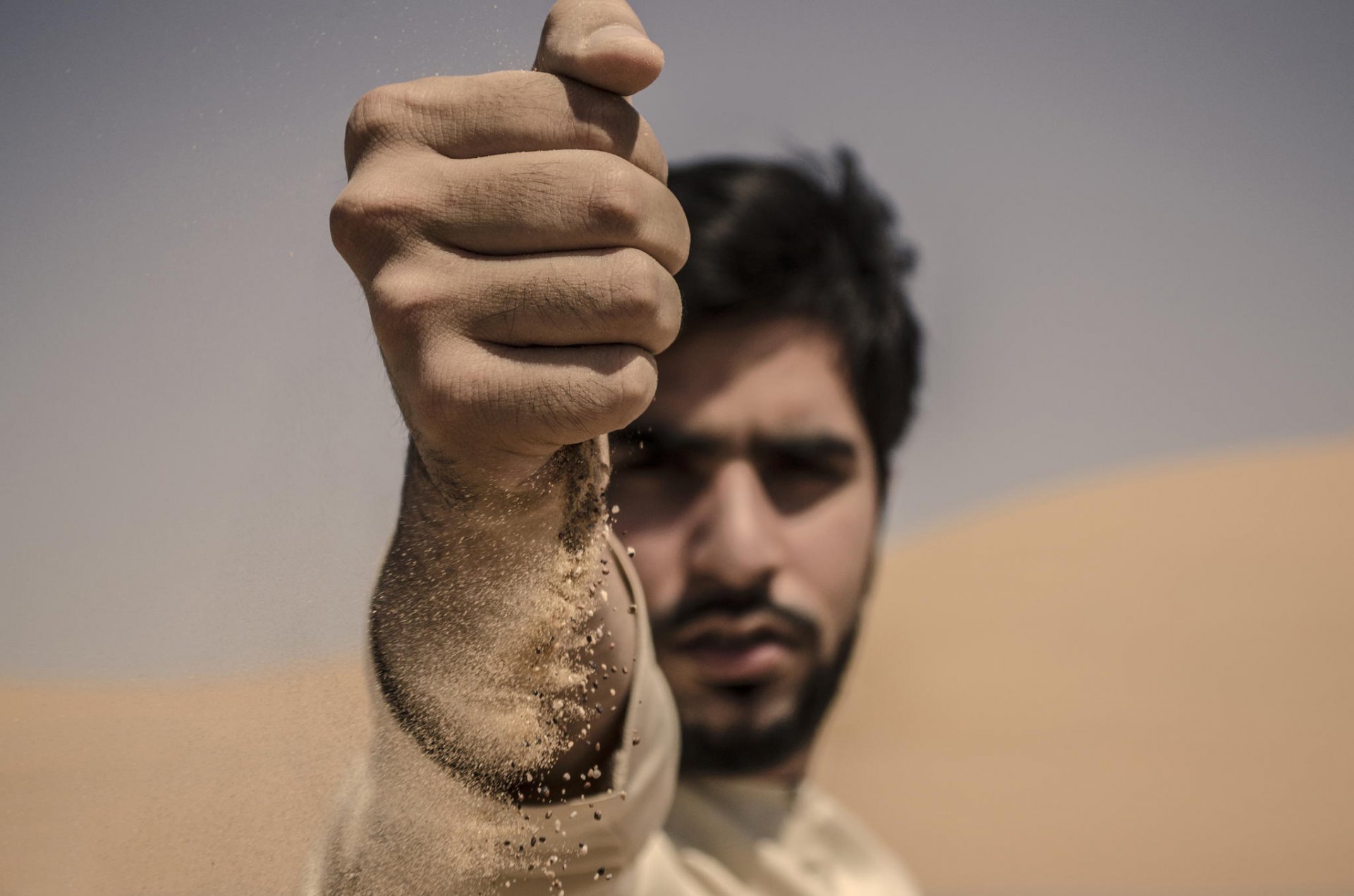 Un homme assis dans un costume sur le sable, sous un parapluie