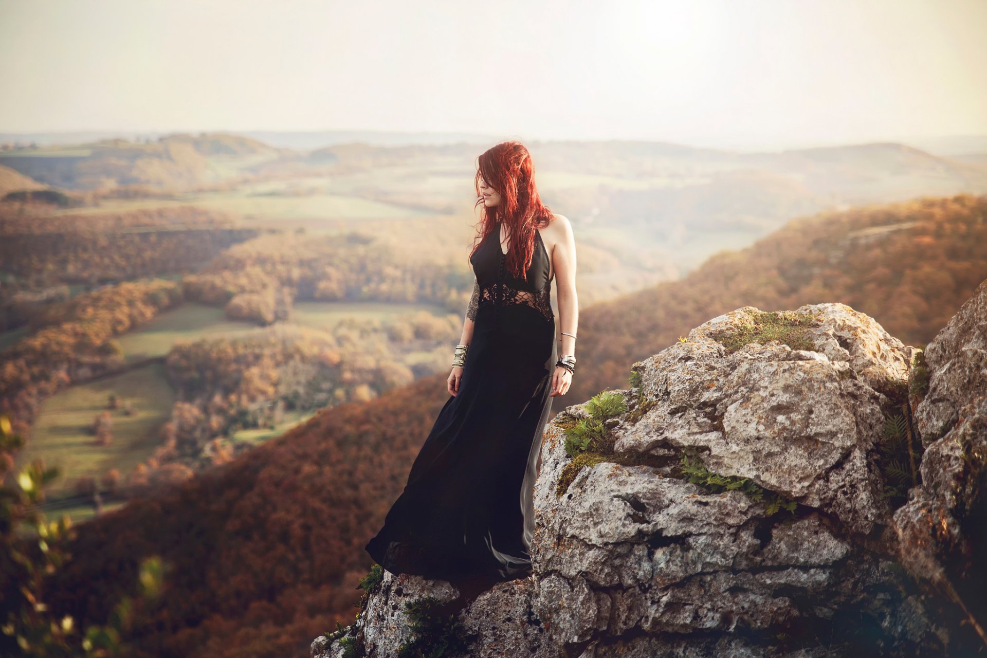 Modèle aux cheveux roux sur un rocher parmi les pierres