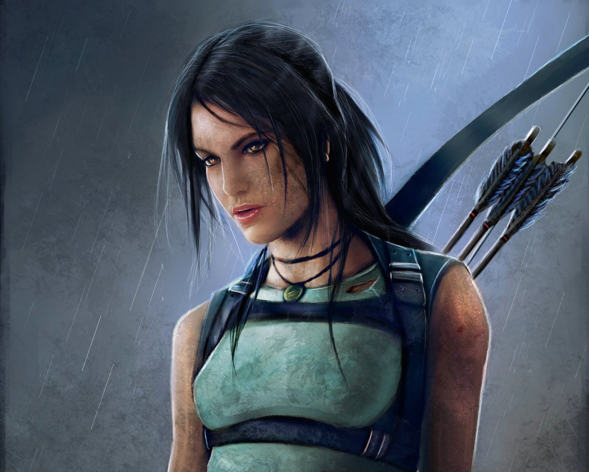 Lara Croft. Fille avec un arc et une main ensanglantée