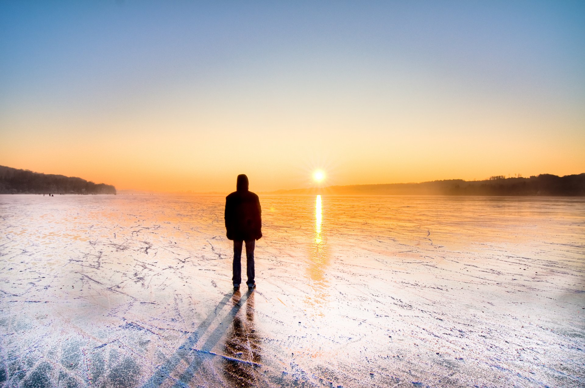 Homme sur le patin à glace admirant le coucher du soleilHomme sur le patin à glace admirant le coucher du soleil