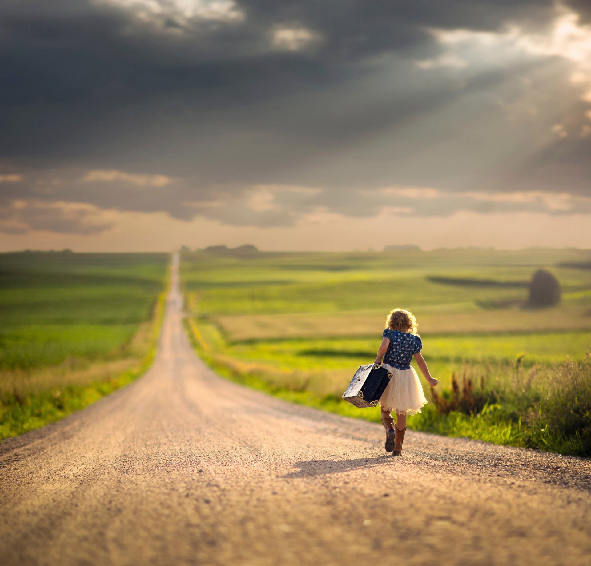 La fille à la valise allant sur la route. le long cheminLa fille à la valise allant sur la route. Le long chemin
