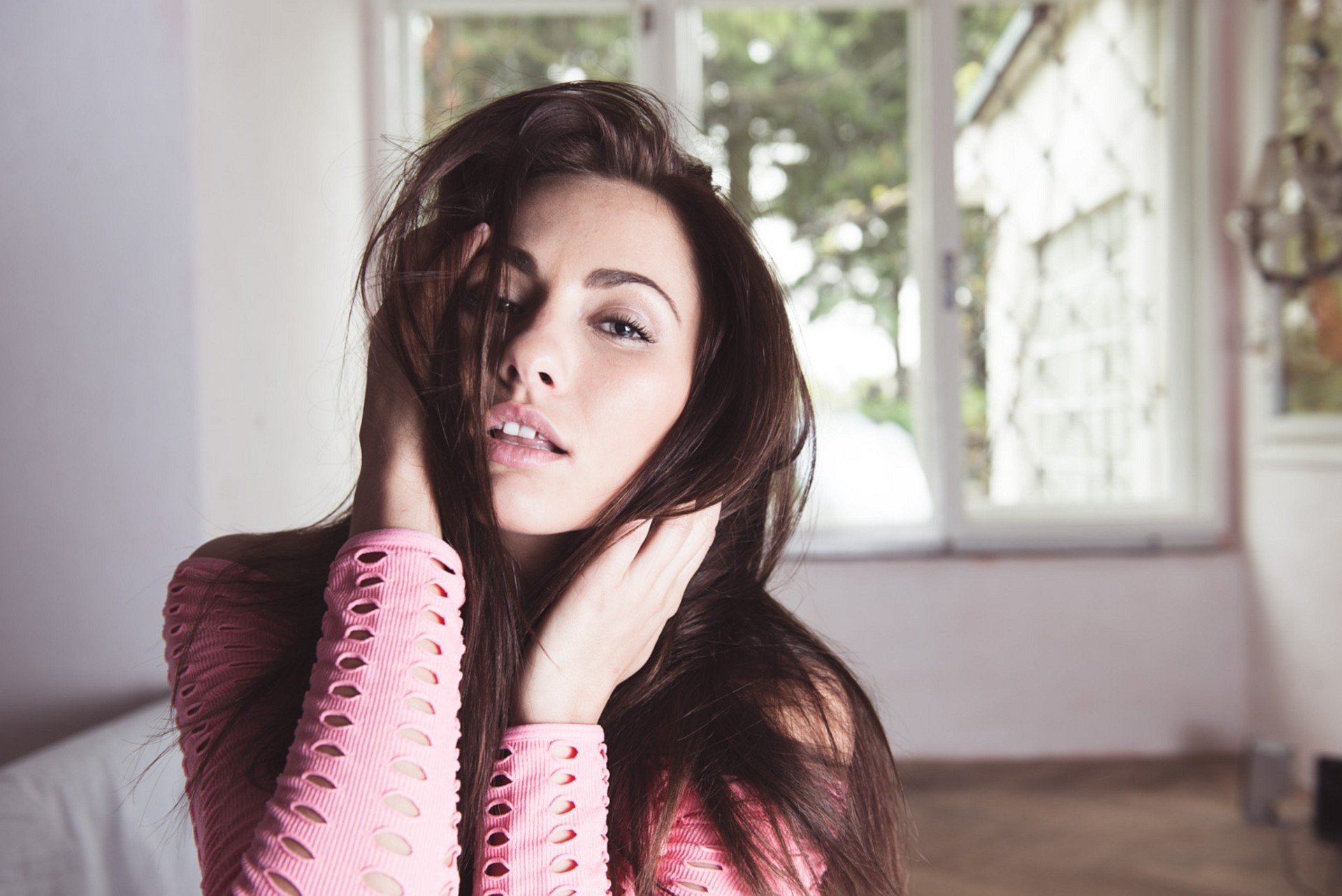 Brunette sexy sur le lit en bas