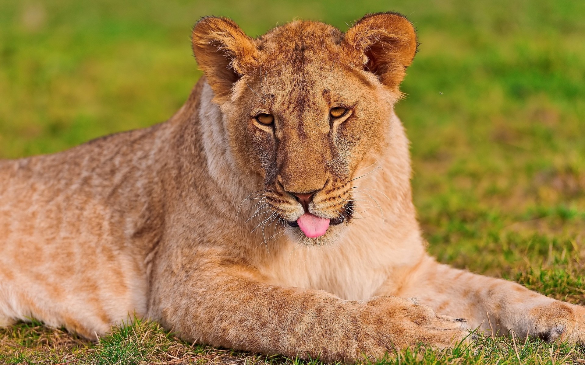 Lionne aux yeux jaunes se trouve sur l'herbe sèche