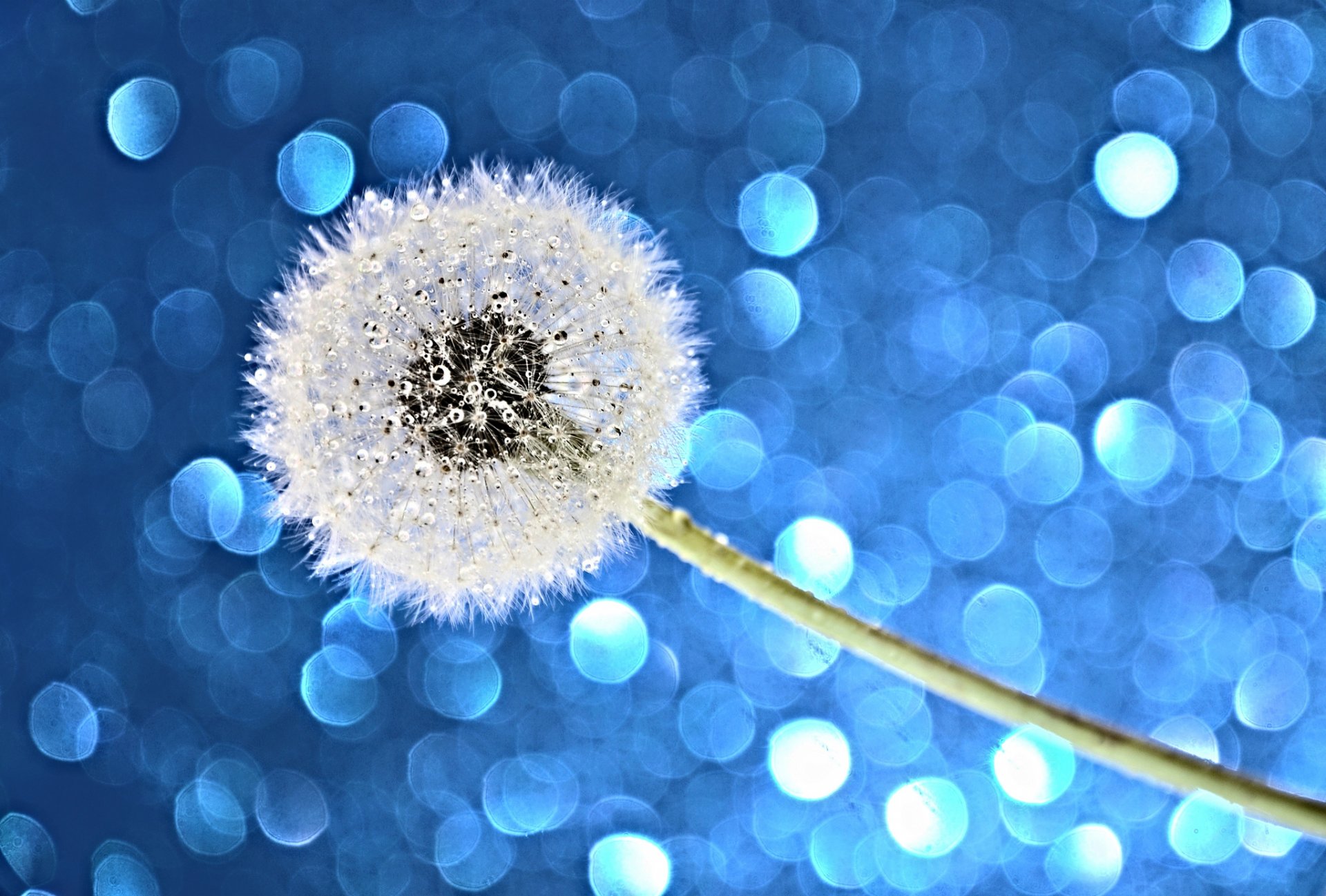 Gouttes de rosée sur un pissenlit blanc avec des refletsGouttes de rosée sur un pissenlit blanc avec des reflets