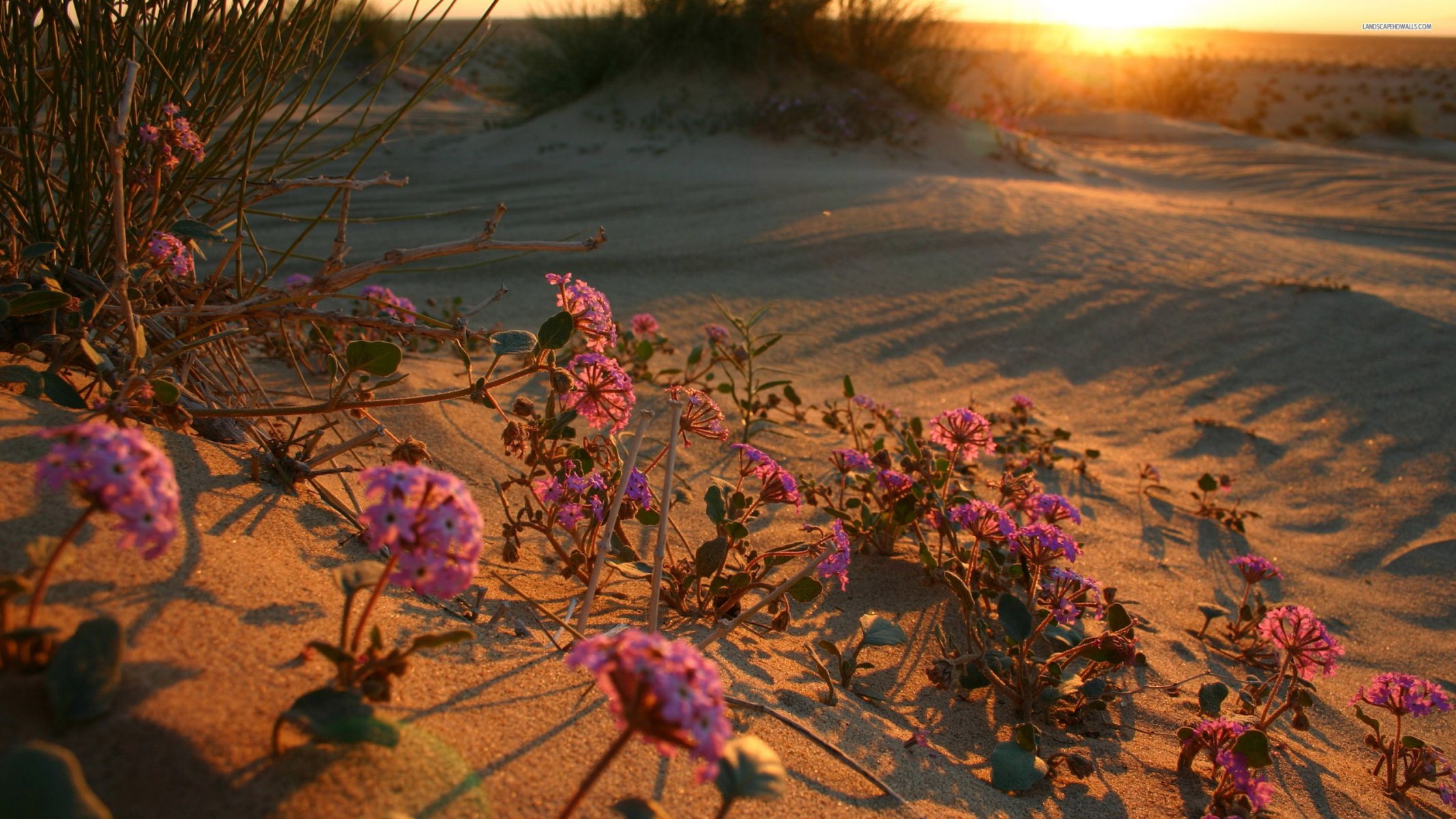 Coucher de soleil dans le désert avec des fleurs sur le sableCoucher de soleil dans le désert avec des fleurs sur le sable