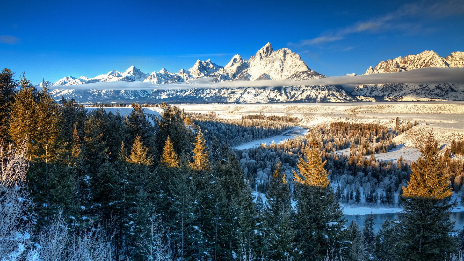 Sommets enneigés fantastiques des montagnes et de la forêtSommets enneigés fantastiques des montagnes et de la forêt