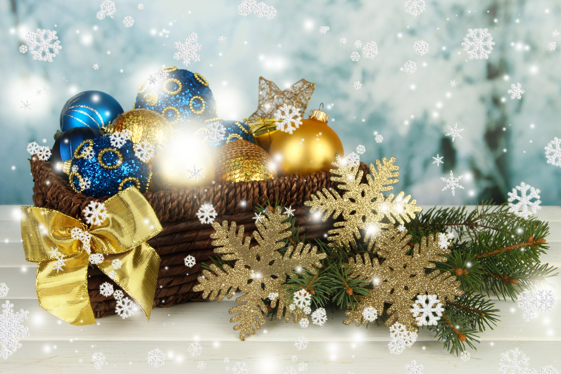 Décorations de noël brillant sur fond bleu avec des flocons de neigeDécorations de Noël brillant sur fond bleu avec des flocons de neige