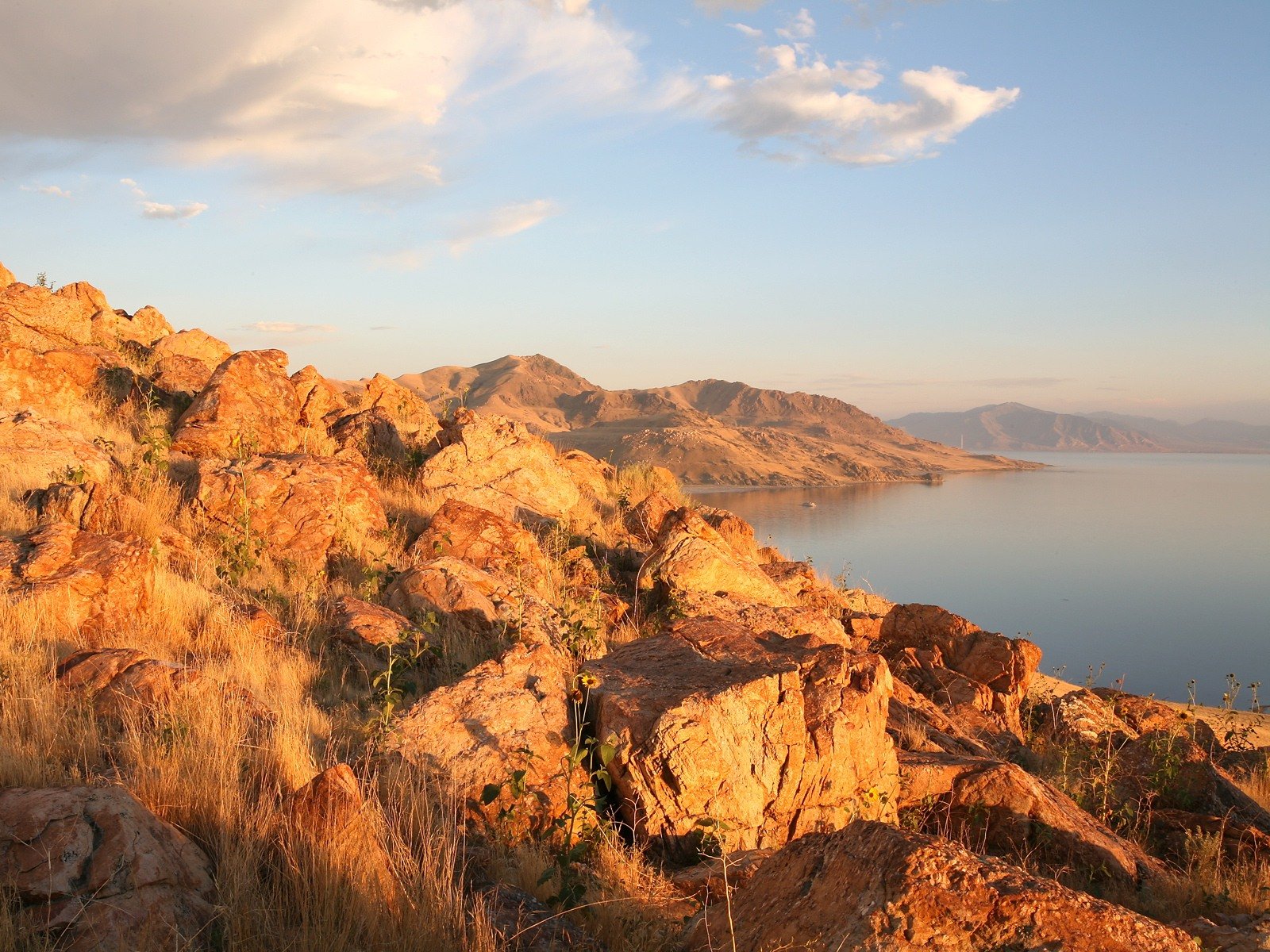 Paysage avec lac de montagne sur fond de ciel bleuPaysage avec lac de montagne sur fond de ciel bleu