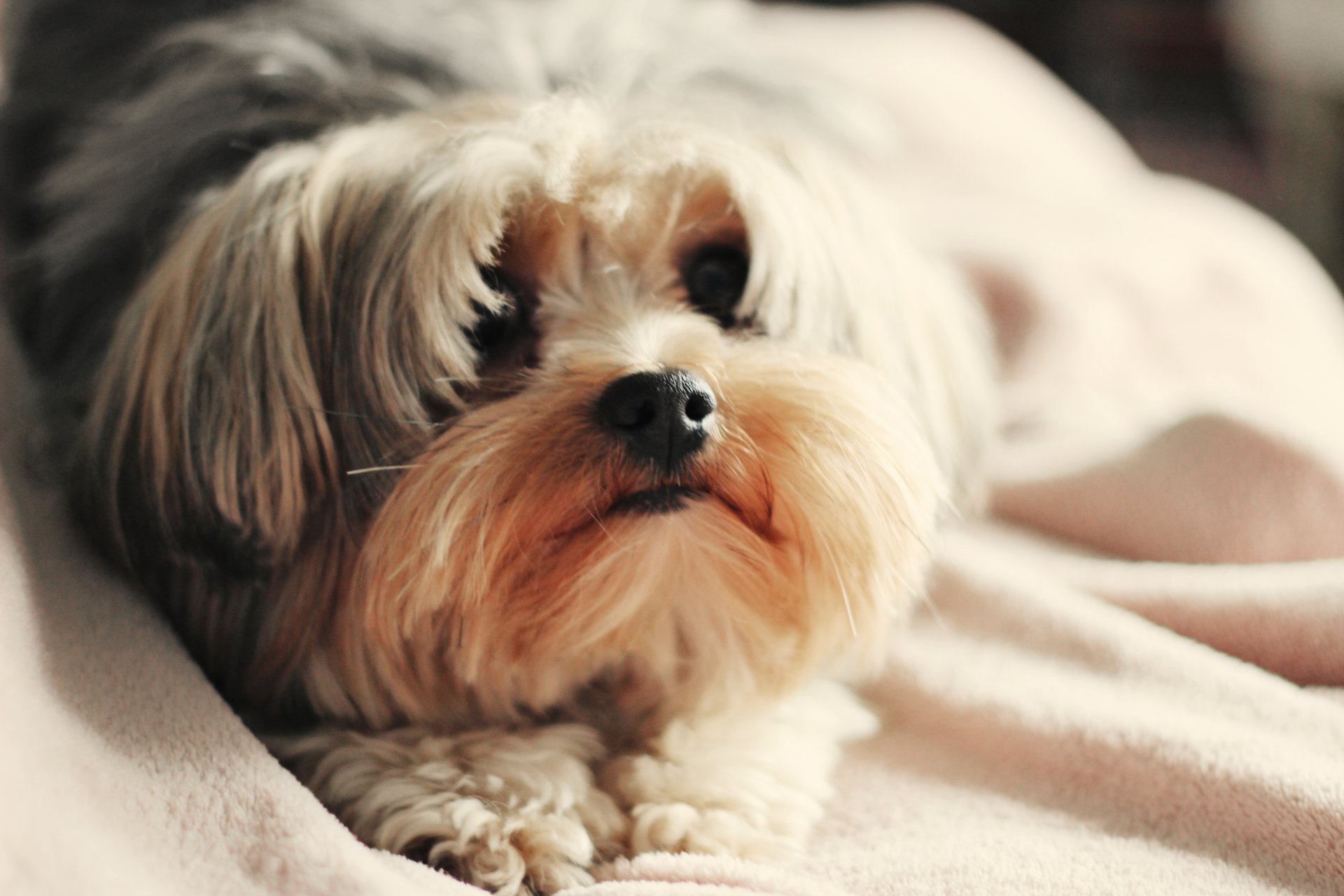 Petit chien dans une couverture avec un joli museauPetit chien dans une couverture avec un joli museau