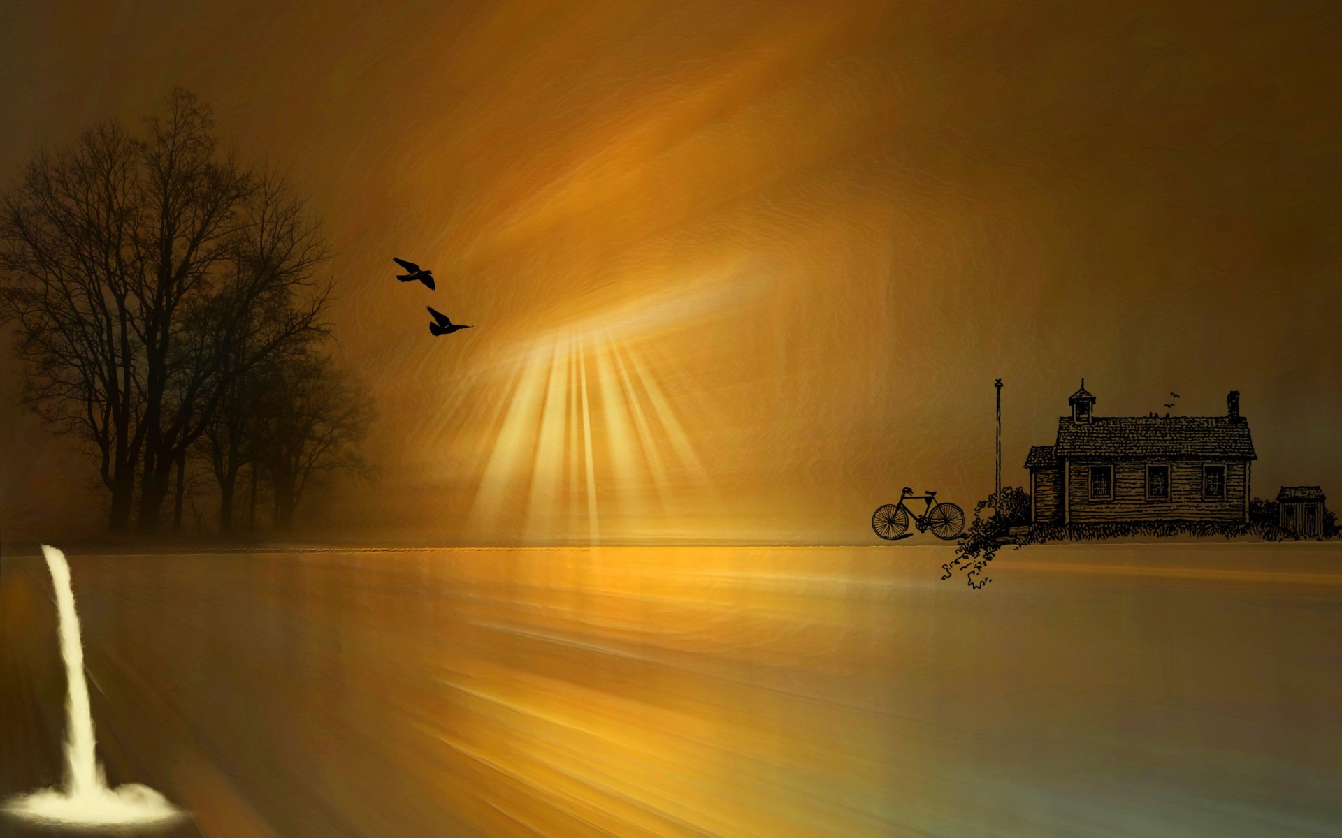 Maison avec un vélo au loin et deux oiseaux sur fond orange-brunMaison avec un vélo au loin et deux oiseaux sur fond orange-brun