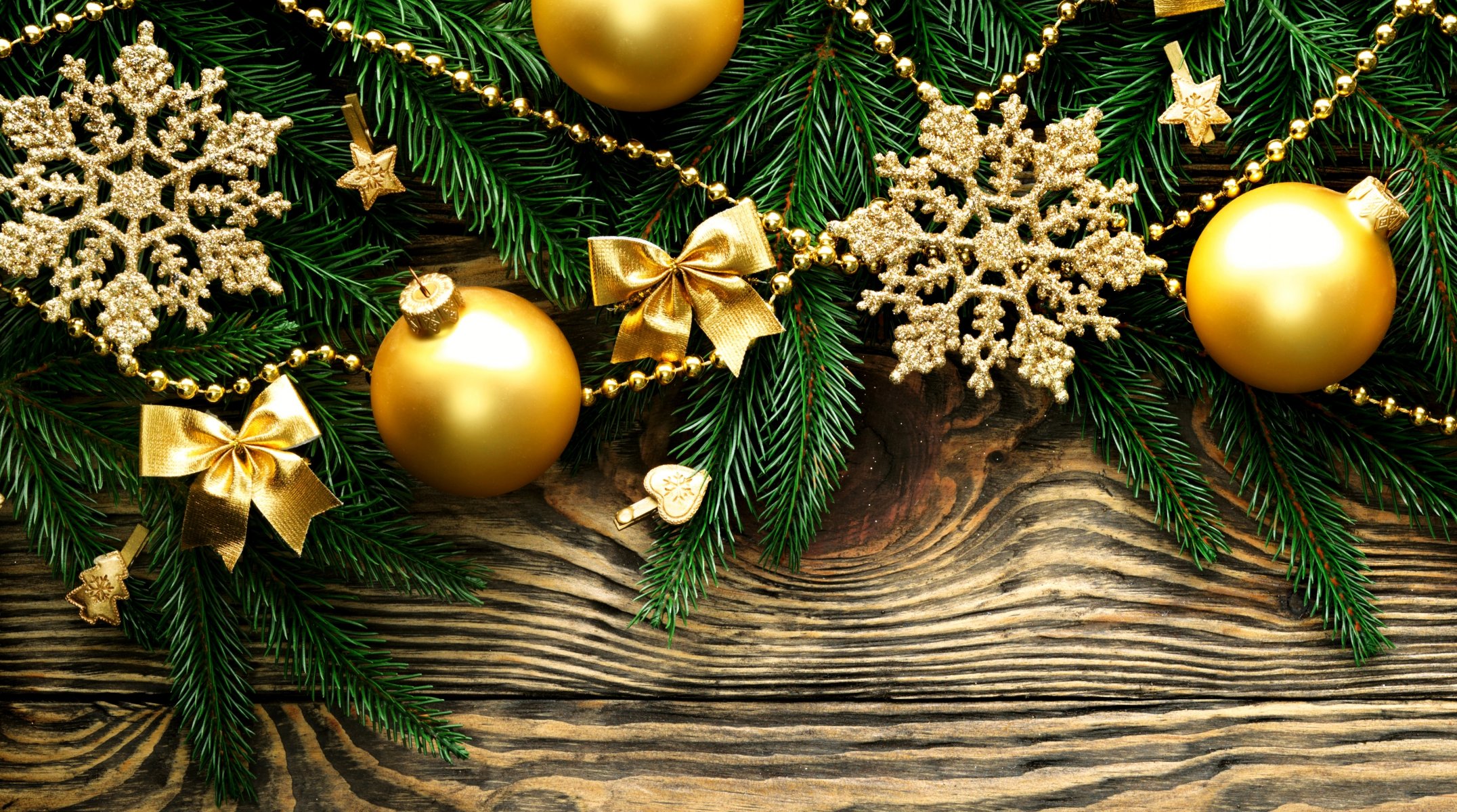 Flocons de neige d'or, boules et arcs sur une branche de sapin