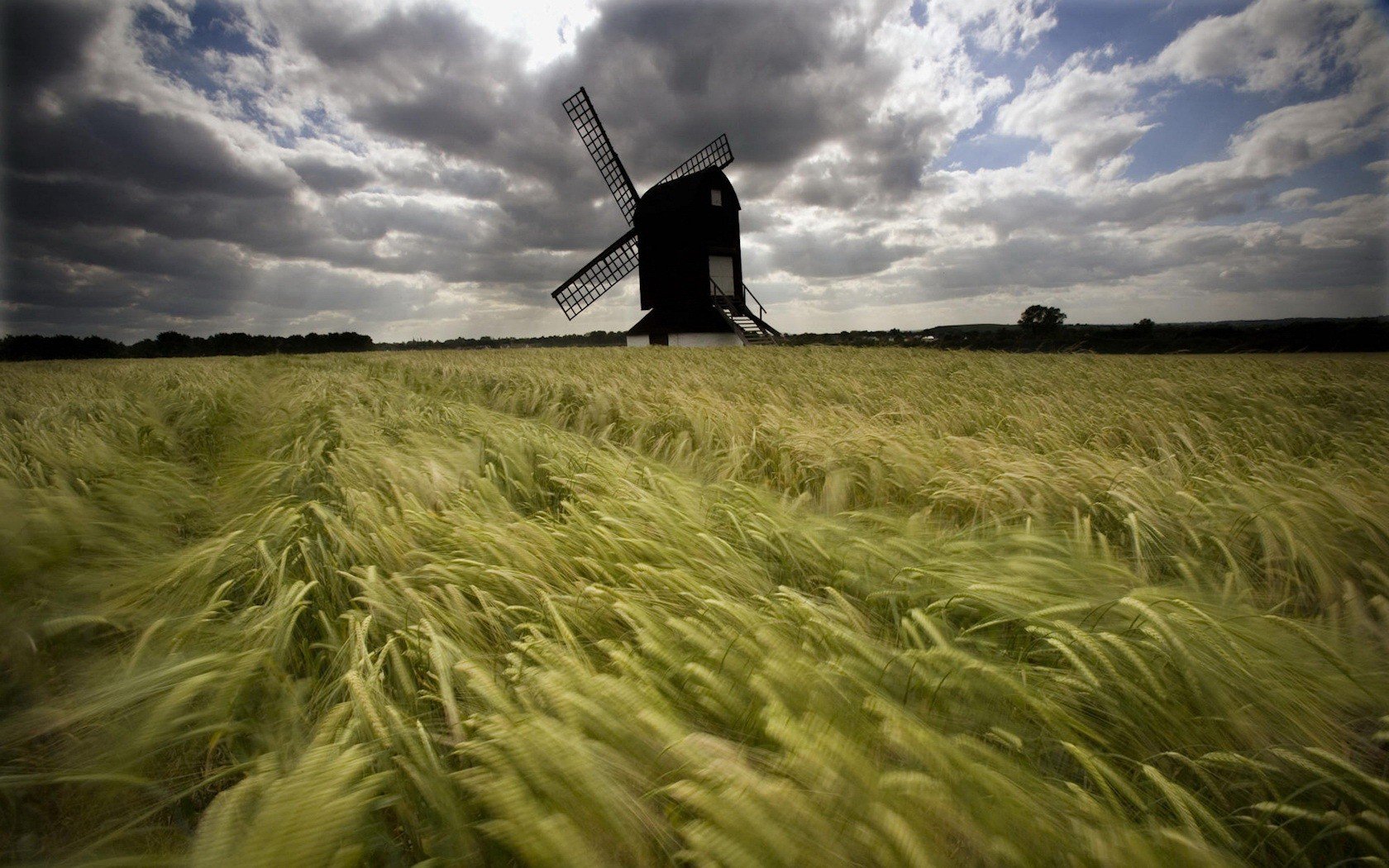 Moulin à vent sur fond de ciel bleu et de fleurs jaunes