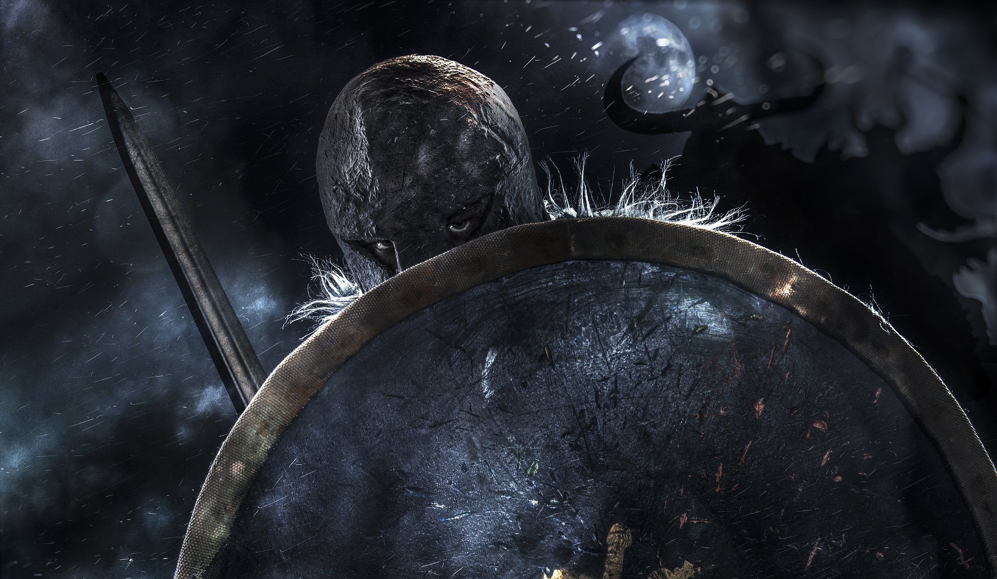 Guerrier avec une épée et un bouclier dans les ténèbresGuerrier avec une épée et un bouclier dans les ténèbres