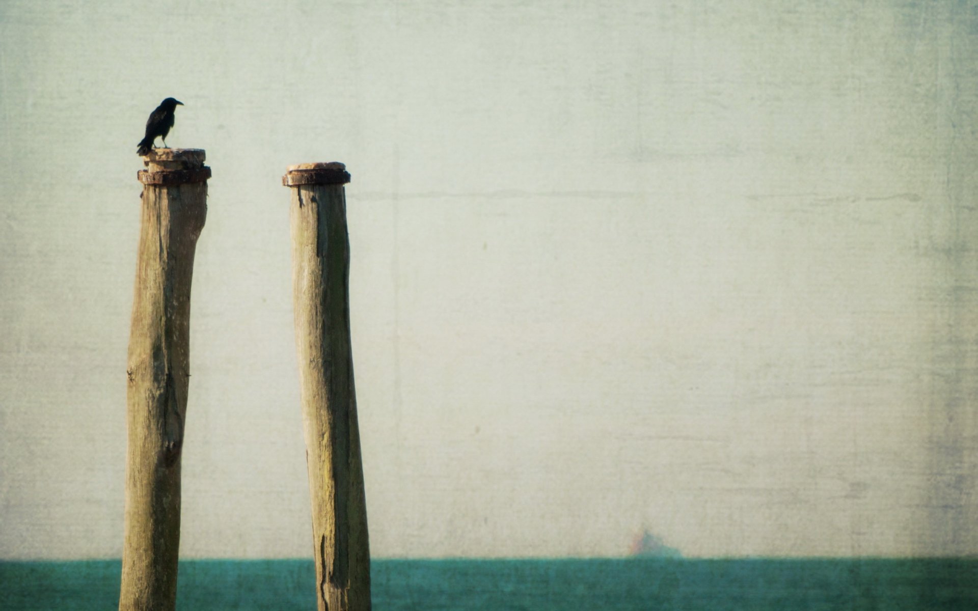 Deux piliers sur le fond de la mer et un oiseau est assis sur eux