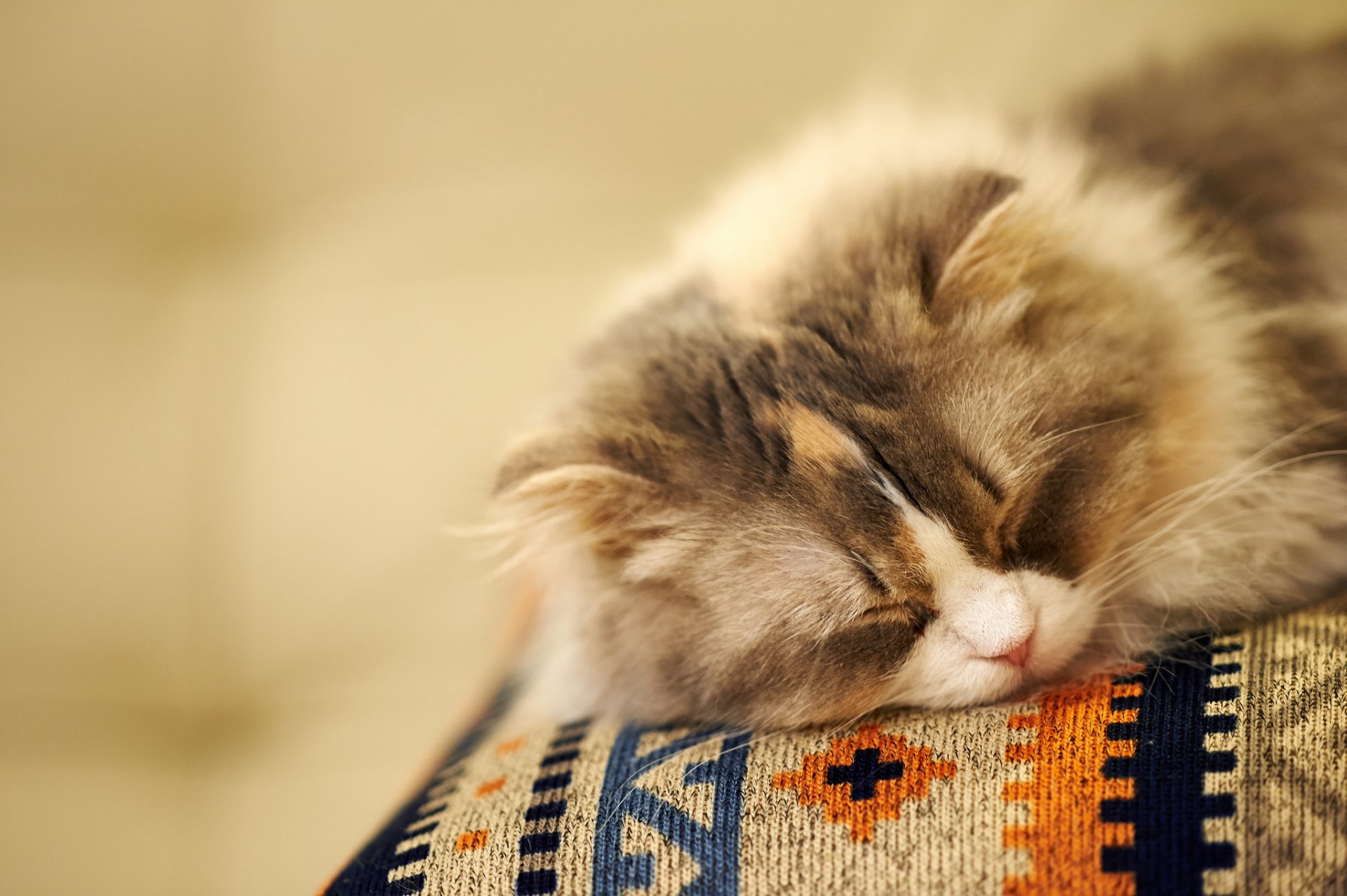 Chat moelleux dort paisiblement sur un oreiller coloréChat moelleux dort paisiblement sur un oreiller coloré
