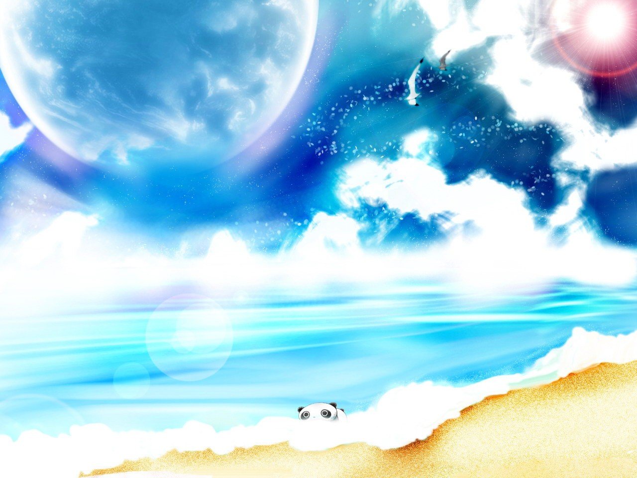 Panda et mouettes au bord de la mer