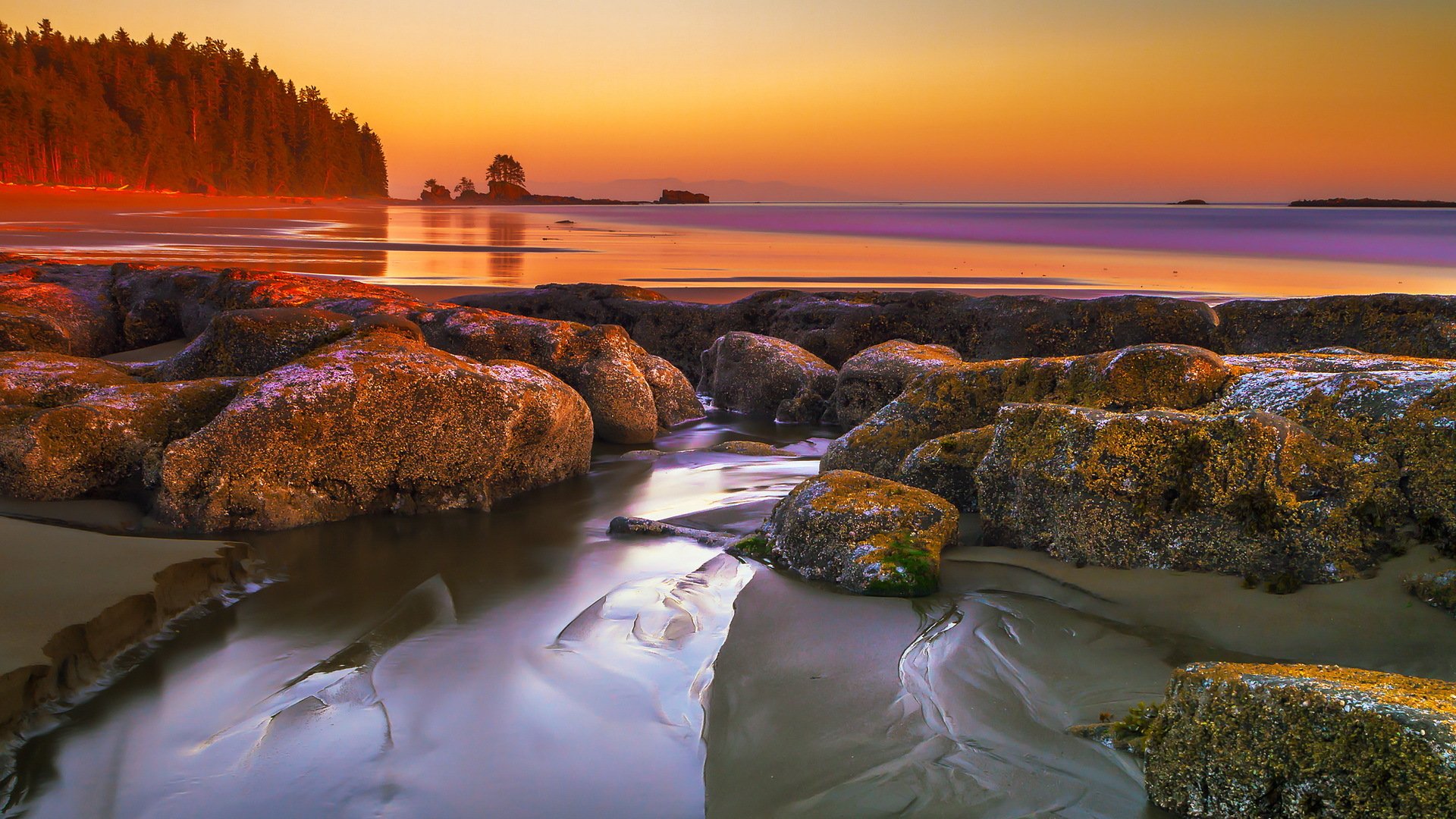 Ciel étoilé au-dessus de la jetée près du lac. Au loin, on voit les montagnes
