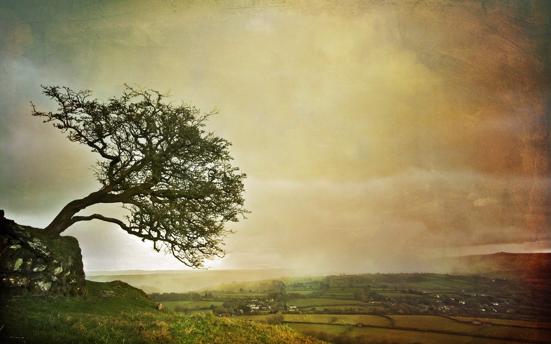 Paysage de champ vert avec route sur fond de montagnes basses et ciel sombrePaysage de champ vert avec route sur fond de montagnes basses et ciel sombre