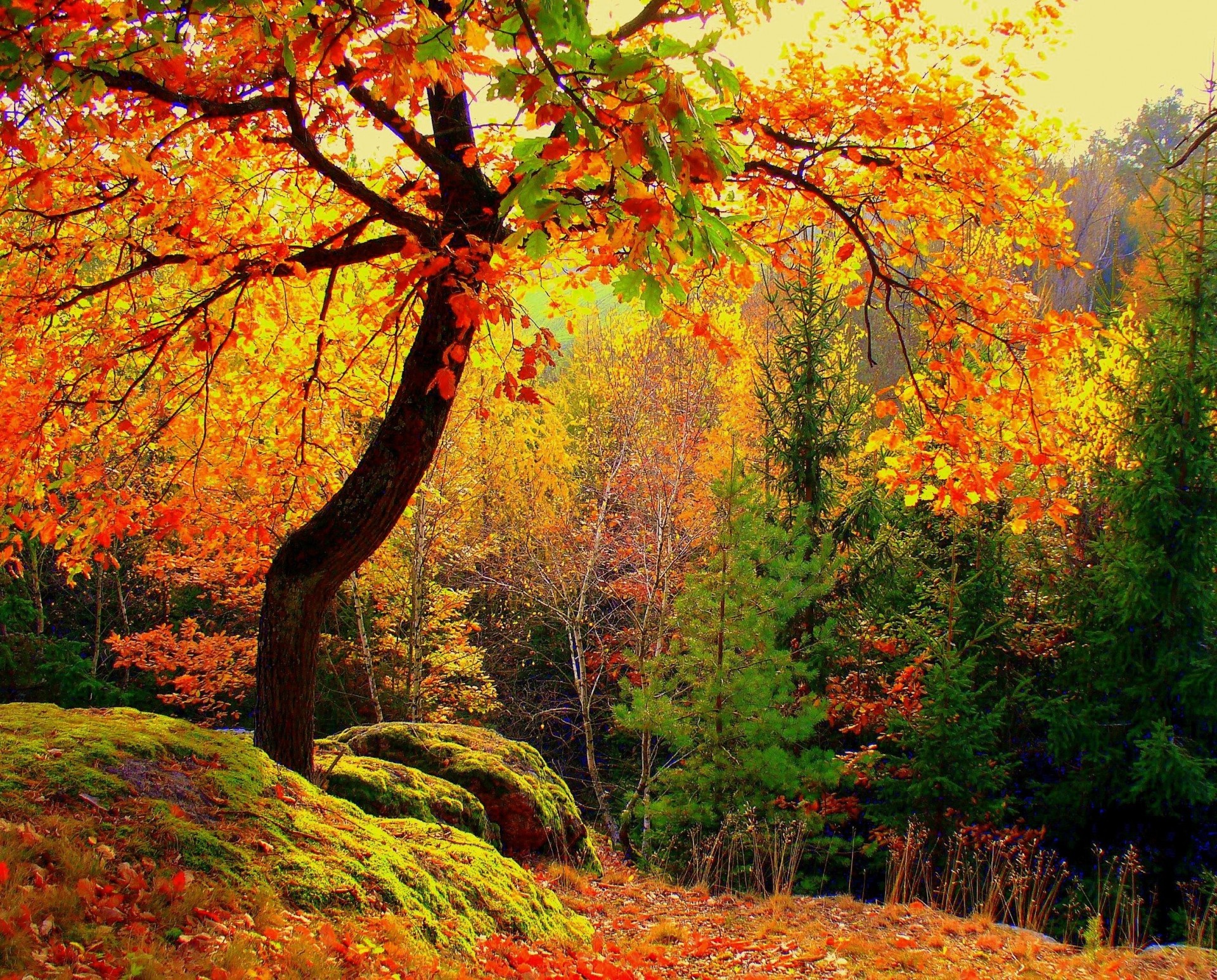 Paysage d'automne lumineux, forêt dense derrière le lac, pierresPaysage d'automne lumineux, forêt dense derrière le lac, pierres
