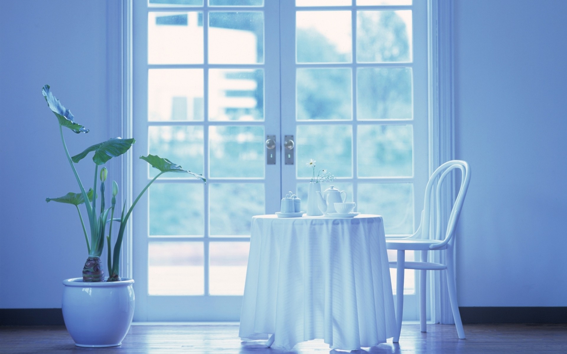 Table avec des appareils à thé et à côté d'un pot avec une planteTable avec des appareils à thé et à côté d'un pot avec une plante