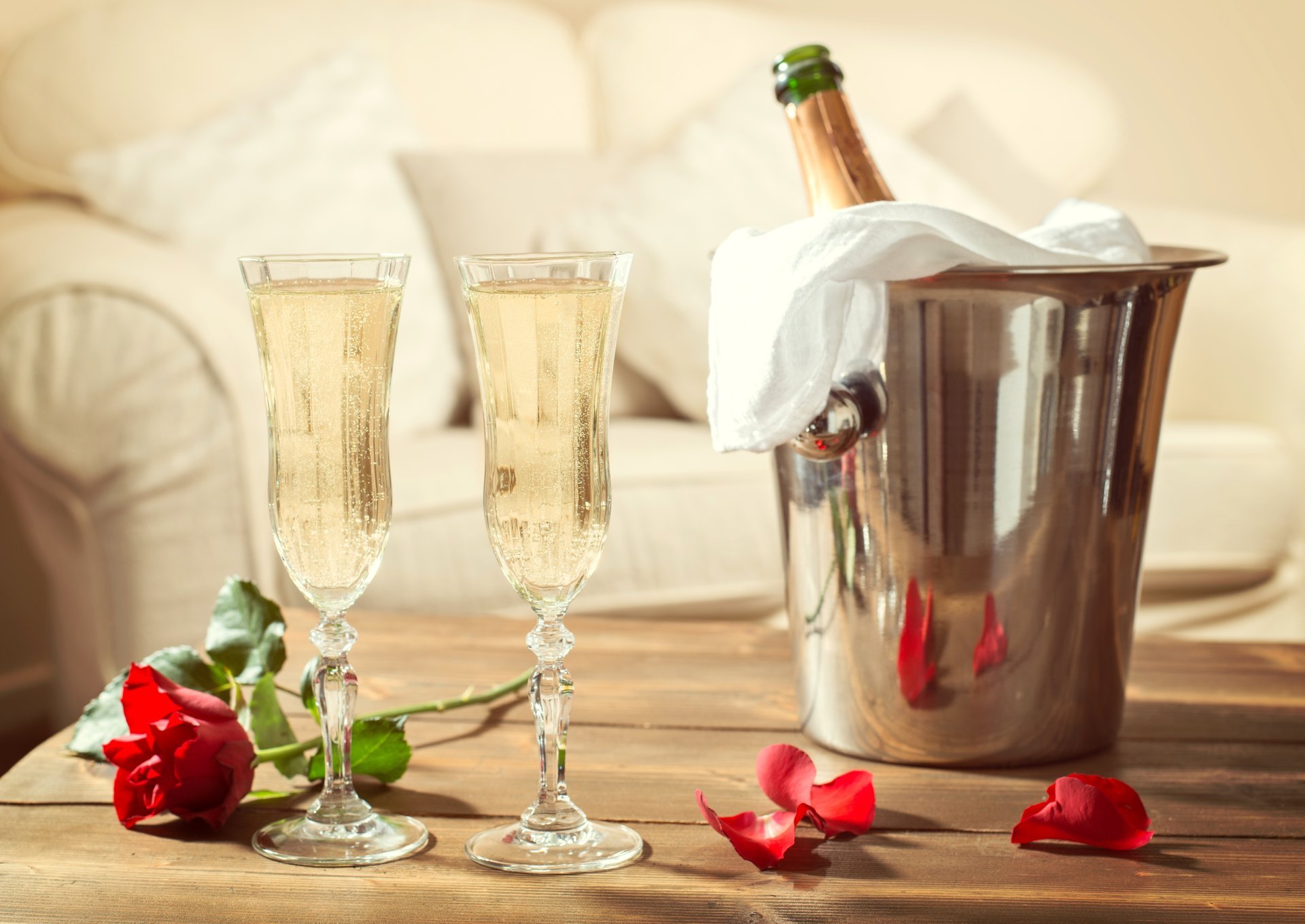 Deux verres et champagne dans un seau sur la tableDeux verres et champagne dans un seau sur la table