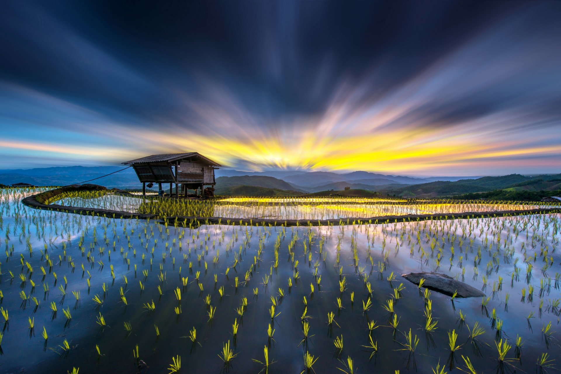Petite maison sur fond de champ avec des germes de plantesPetite maison sur fond de champ avec des germes de plantes