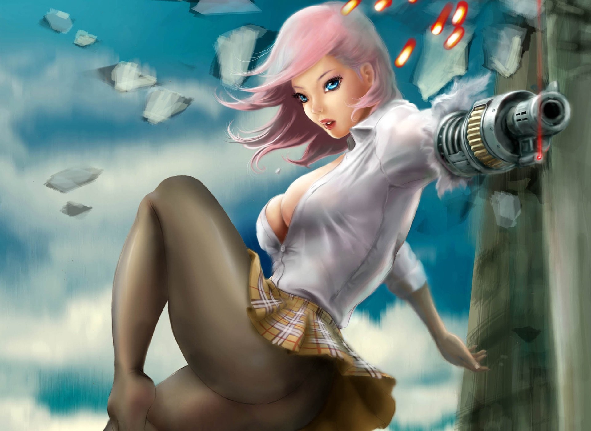 Image d'art d'une fille dans une jupe courte et une veste avec un décolleté profond. arme à la place de la mainImage d'art d'une fille dans une jupe courte et une veste avec un décolleté profond. Arme à la place de la main