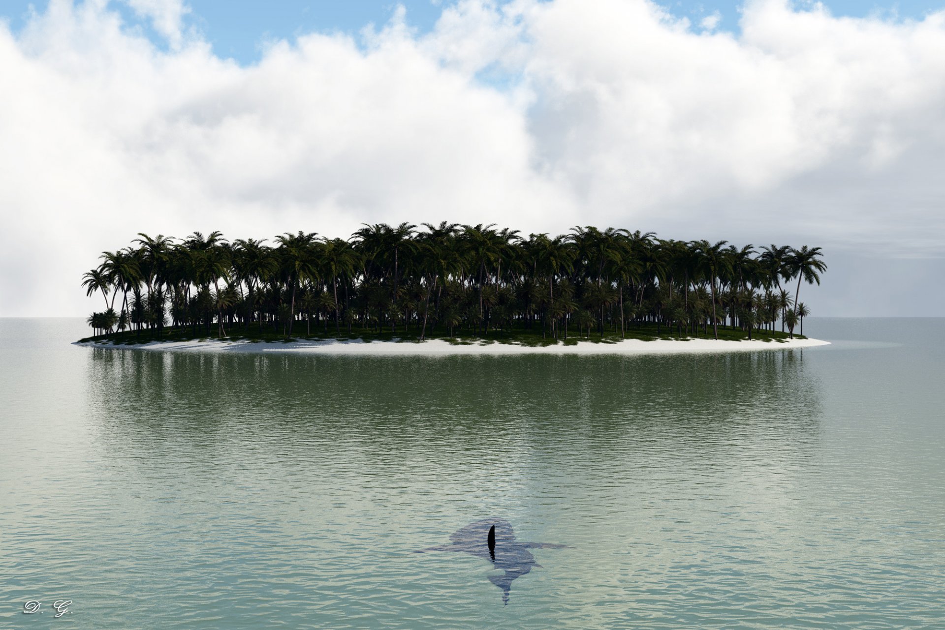 Une île déserte avec des palmiers et l'océan autour deUne île déserte avec des palmiers et l'océan autour de
