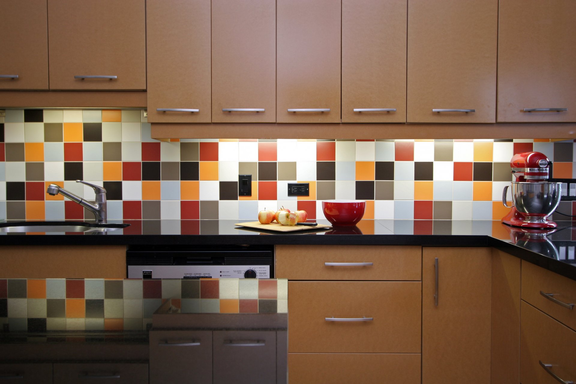 Cuisine lumineuse avec des ustensiles colorés et des carreaux colorés sur le murCuisine lumineuse avec des ustensiles colorés et des Carreaux colorés sur le mur