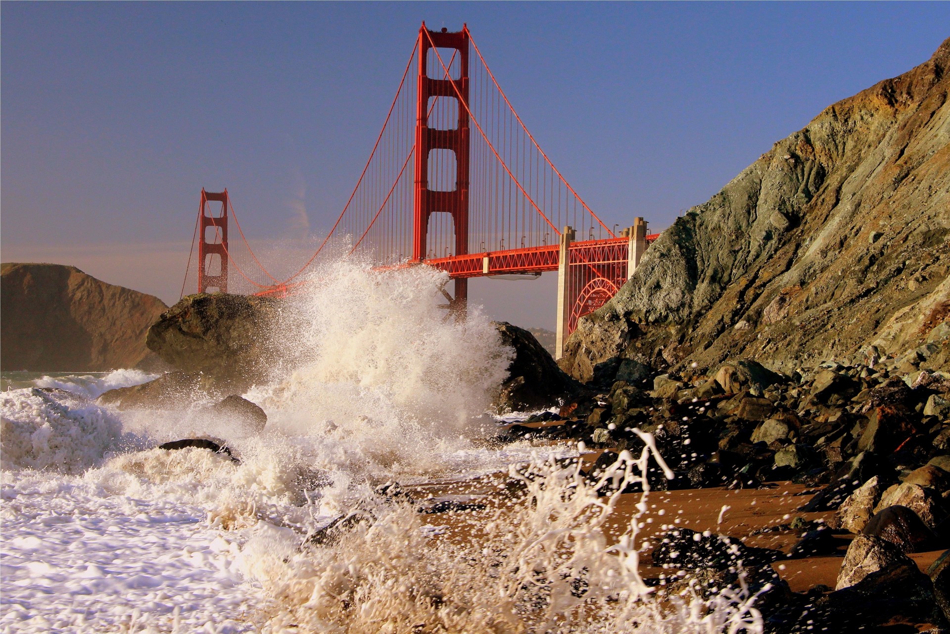 Les vagues du pont battent sur les rochers