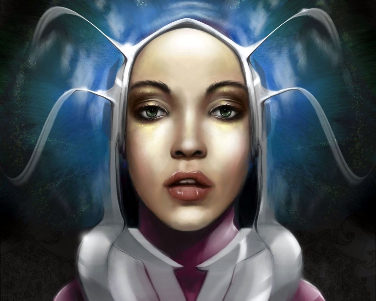 Tête de jeune fille avec la bouche entrouverte en Cap blanc sur fond bleu