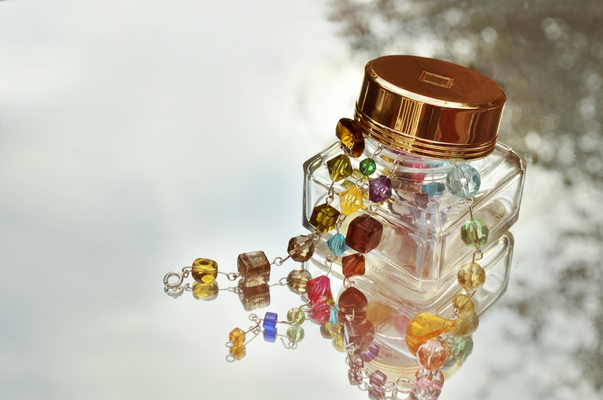 Bijoux fantaisie avec des pierres dans un bocal sur verreBijoux fantaisie avec des pierres dans un bocal sur verre