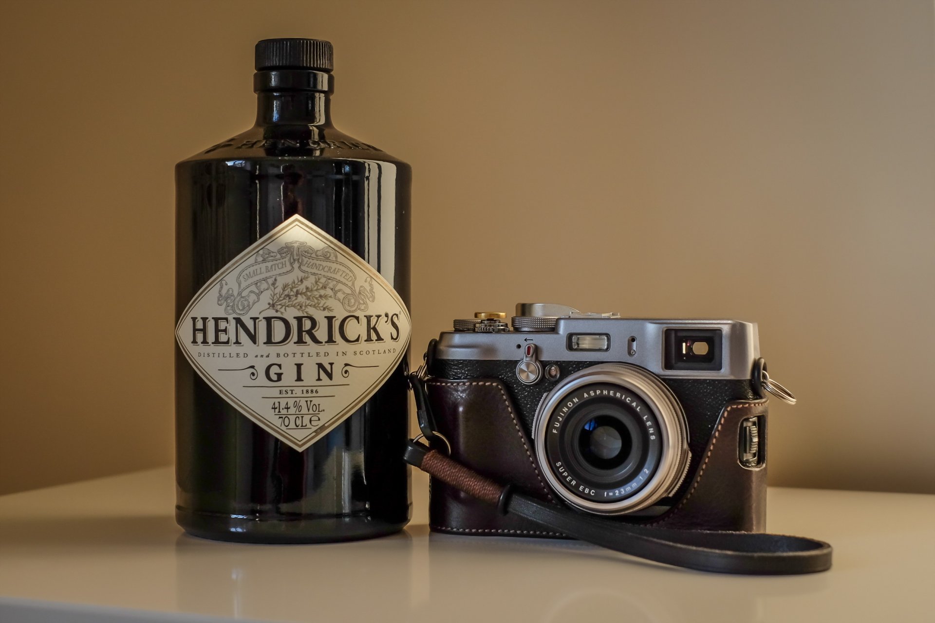 Appareil photo dans un étui sur un fond de bouteille de ginAppareil photo dans un étui sur un fond de bouteille de Gin