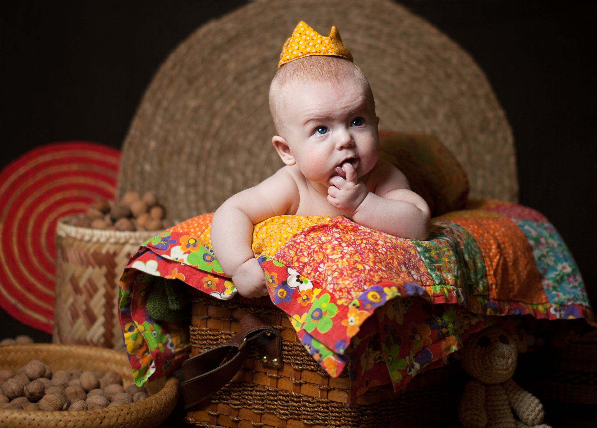 Le bébé sur la couverture réfléchi avec un doigt dans la bouche