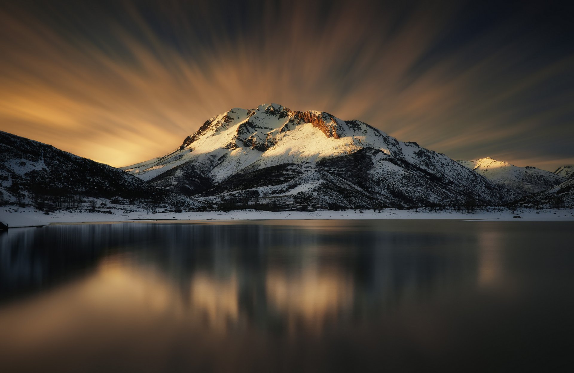 Surface brumeuse. Reflet des montagnes et des forêts dans l'eau