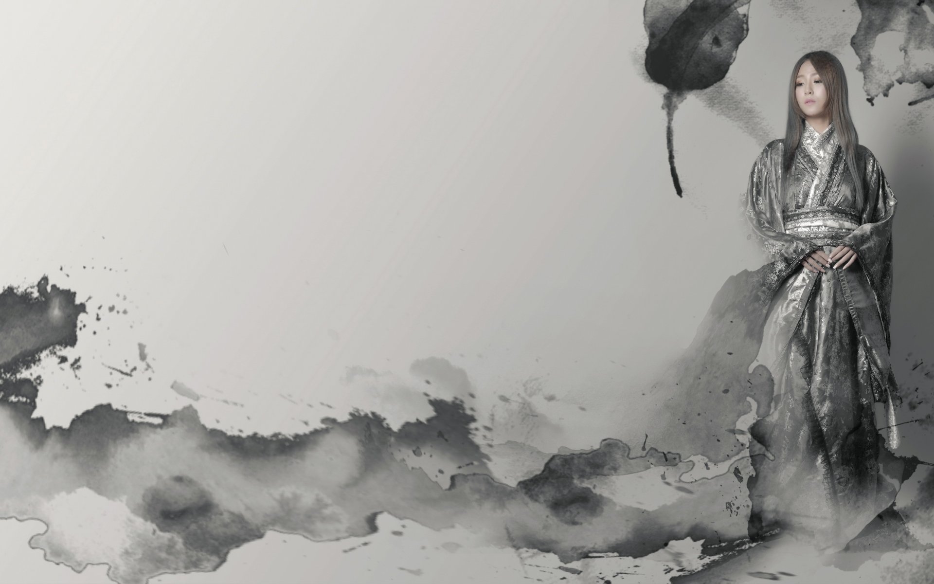 Fille asiatique en robe blanche joue du piano blanc sur fond blancFille asiatique en robe blanche joue du piano blanc sur fond blanc