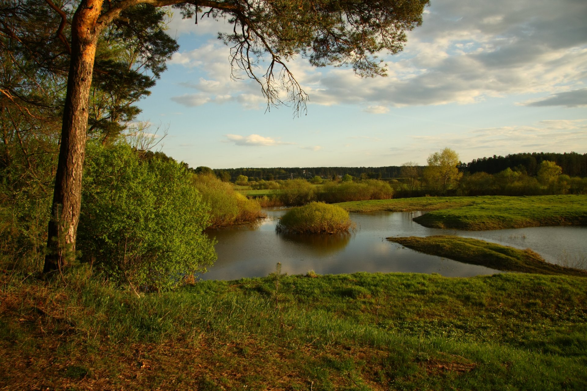 Pin sur la rive de la rivière de la forêt