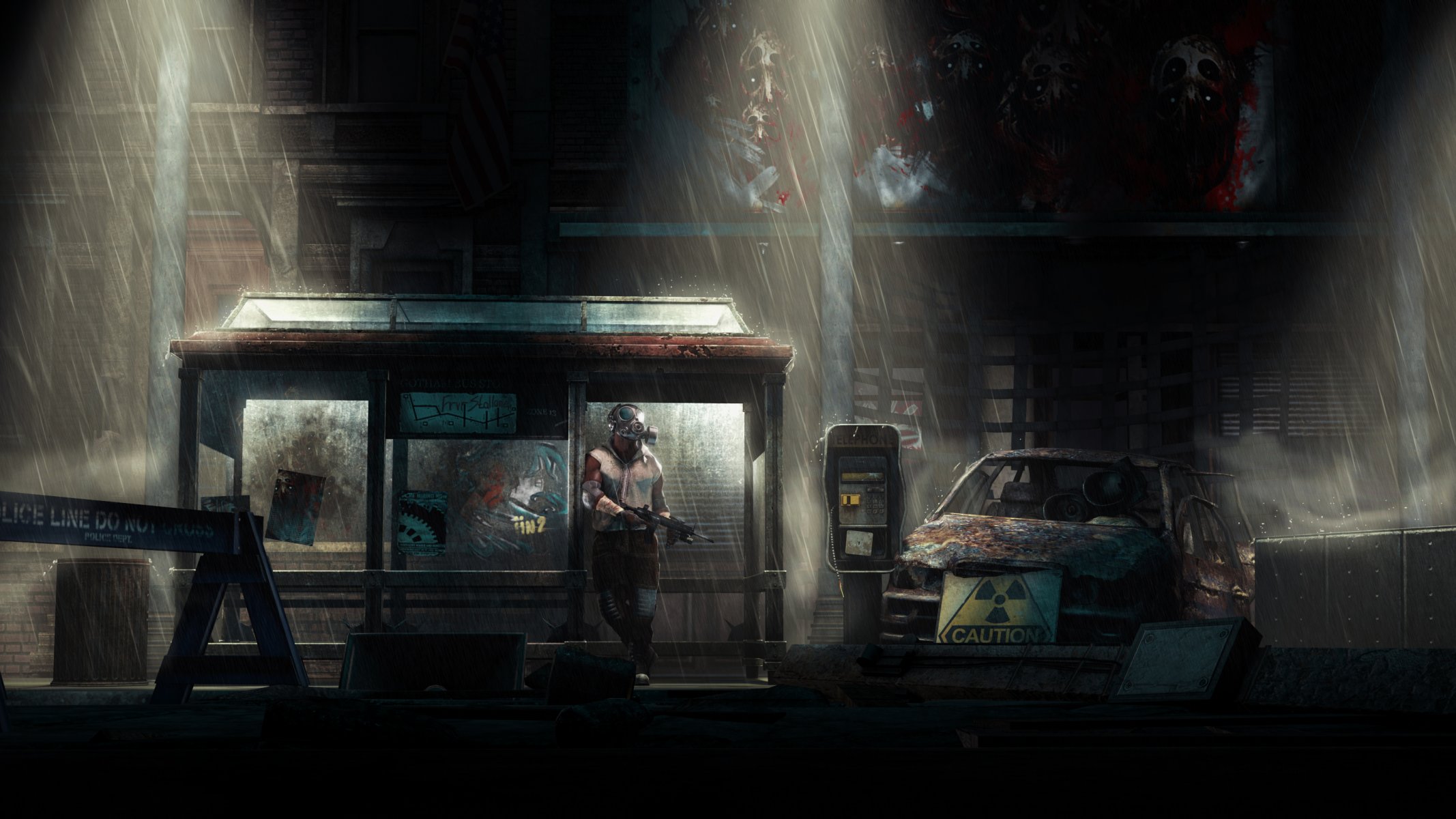 Combattants dans le jeu de métro 2033 en gilets pare-balles sur fond d'église et de ciel dégagéCombattants dans le jeu de métro 2033 en gilets pare-balles sur fond d'église et de ciel dégagé