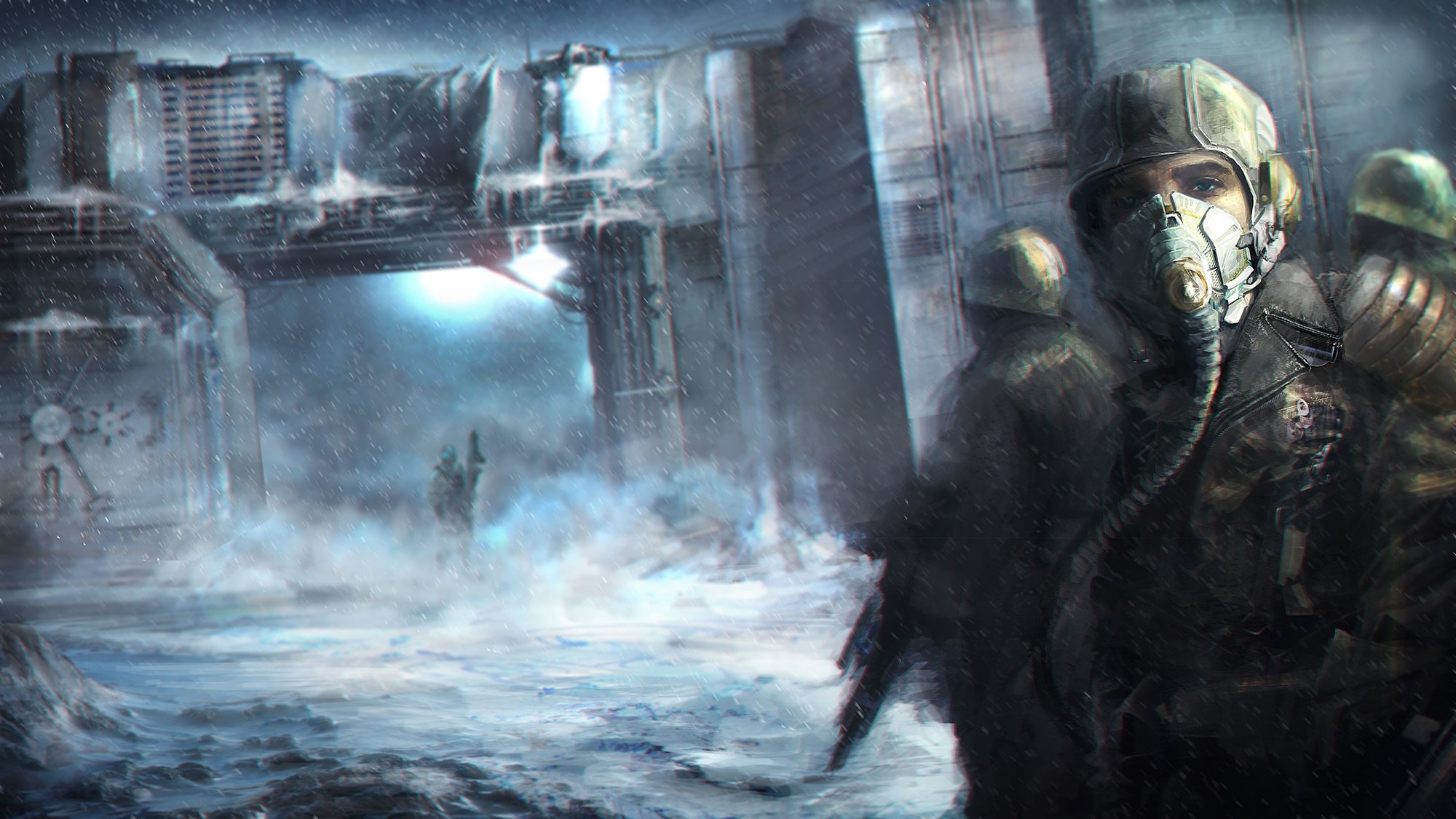 Soldats portant des masques à gaz avec des armes à la baseSoldats portant des masques à gaz avec des armes à la base