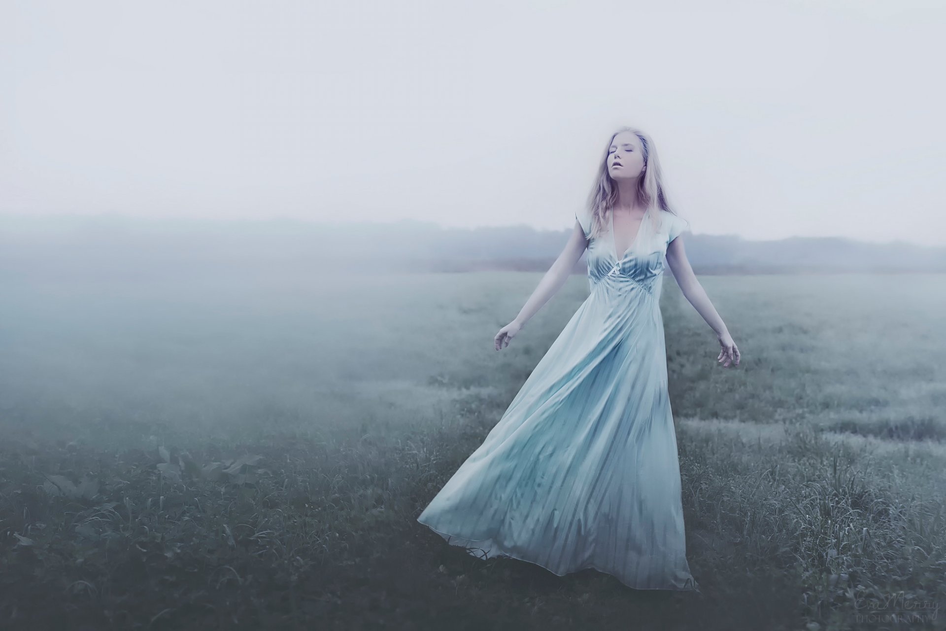 Jeune fille en robe longue se trouve dans le brouillard sur le terrainJeune fille en robe longue se trouve dans le brouillard sur le terrain