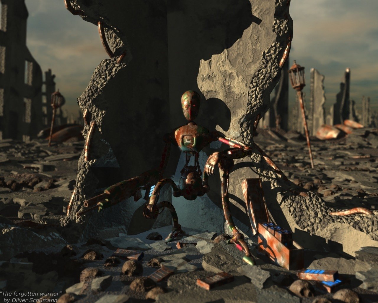 Robot sur les décombres d'un bâtiment dans la ville détruite