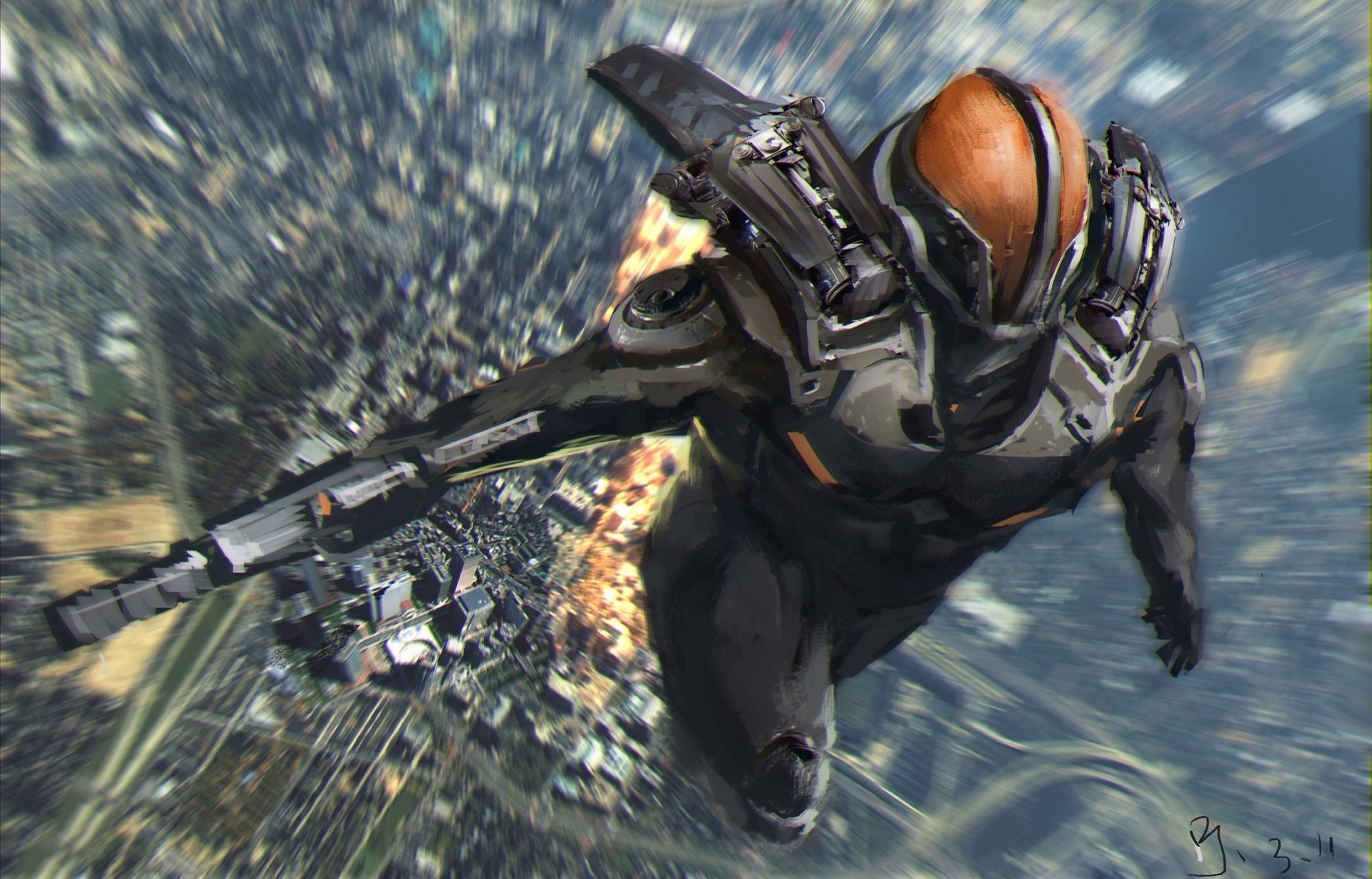 Robot volant au-dessus de la ville à haute altitudeRobot volant au-dessus de la ville à haute altitude